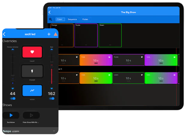At Full Pro is a premium version of our lighting control app, offering users even more creative options. With Pro you can add custom animations & effects to show timelines with the touch of a button. A brand new FX panel allows users to switch between shows, including a tap tempo + custom overrides, and more!
