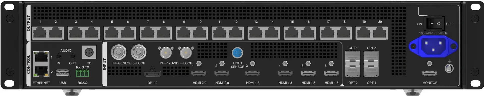 The VX2000 Pro manages up to 13 million pixels with ease, handling massive LED screens at up to 16,384×8,192 resolution. Perfect for wide, tall, and immersive visual experiences.